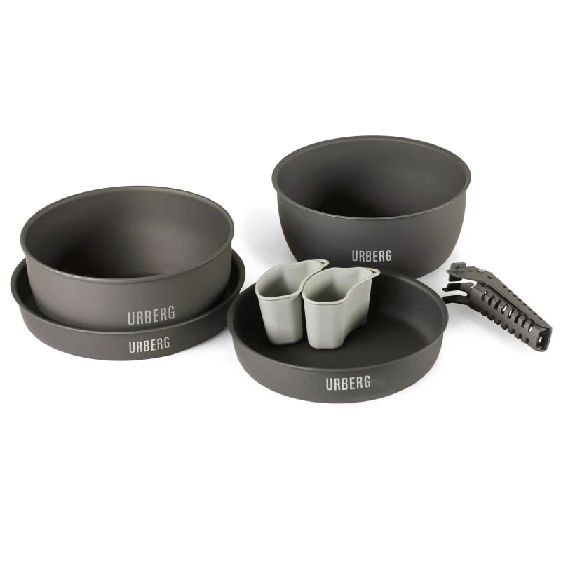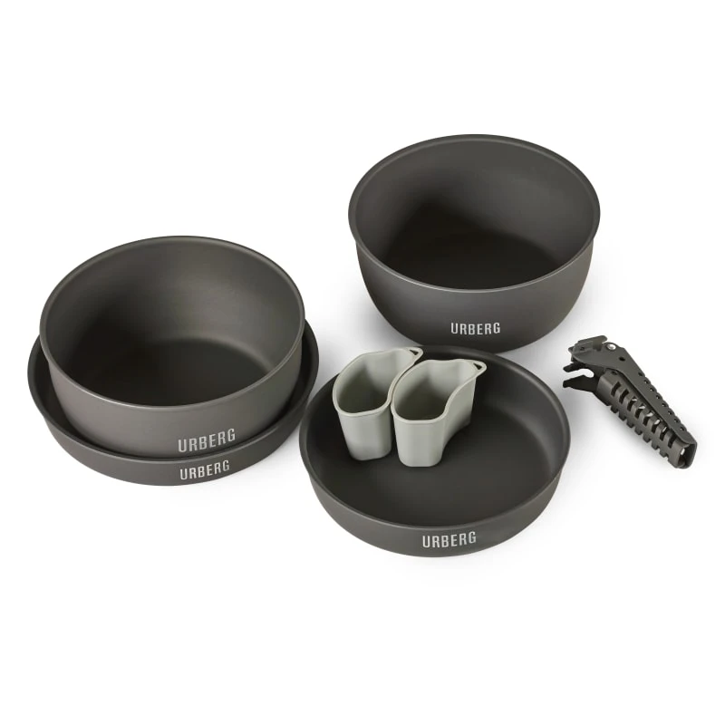 Camping Cookware fra Urberg er et praktisk sett med kasseroller, stekepanner, krus og håndtak som passer for en familie på utflukt.