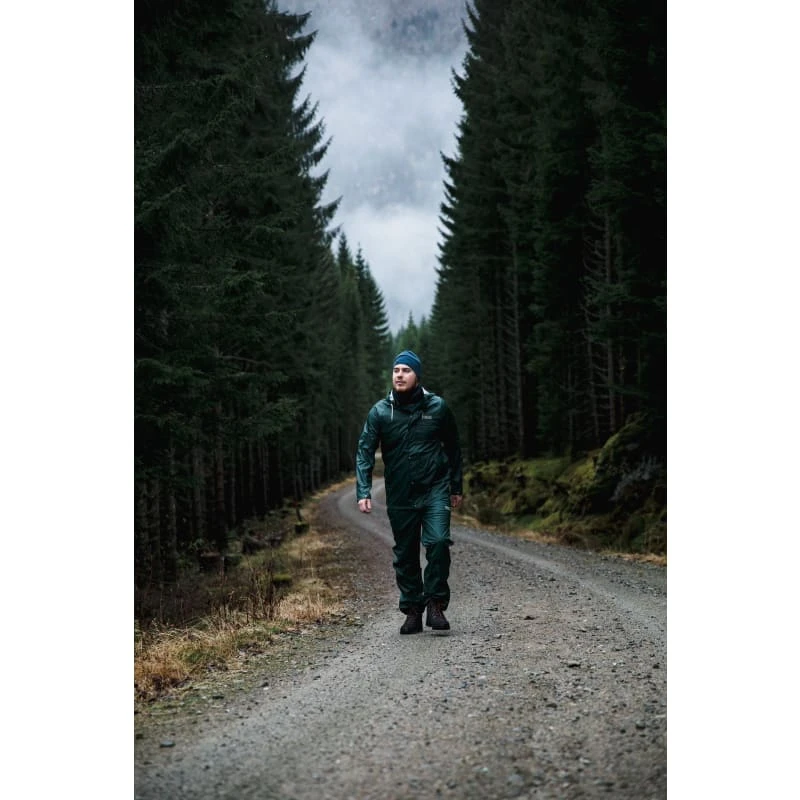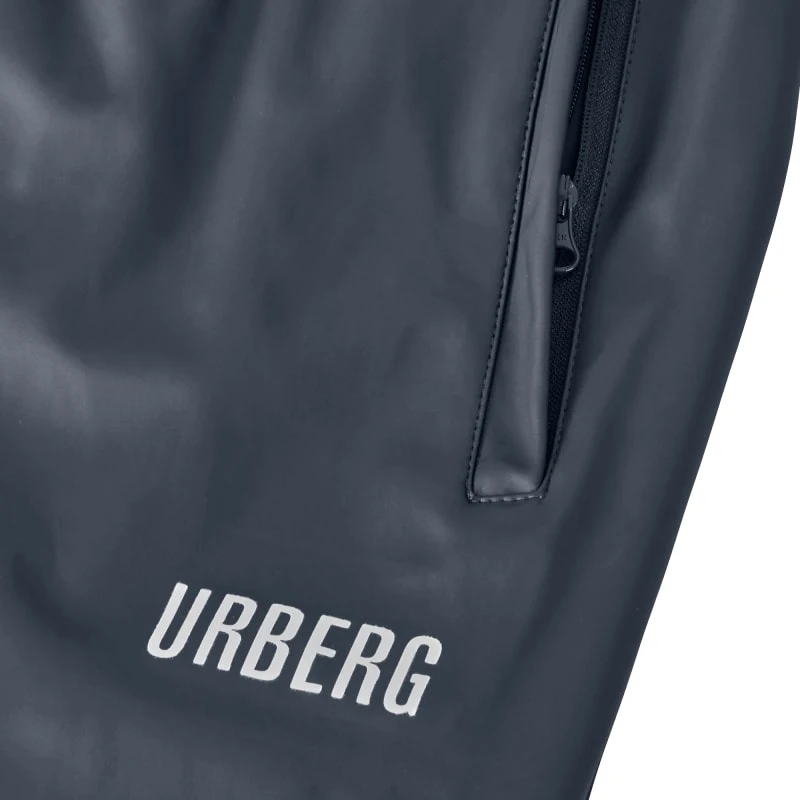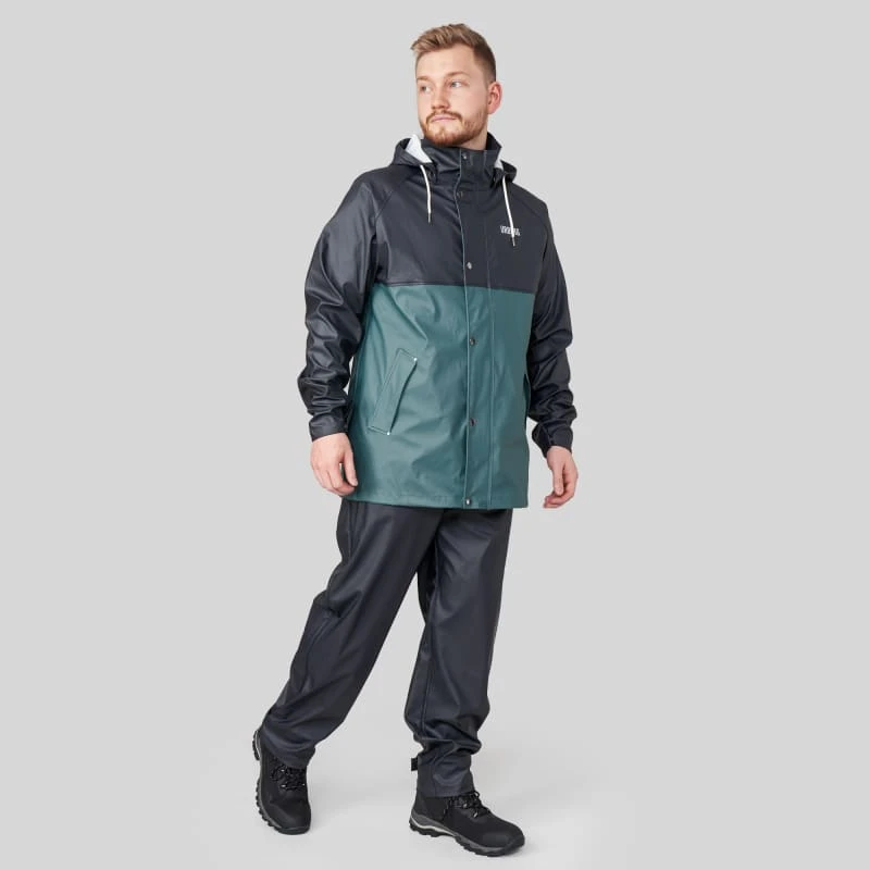 Malme PU Rain Set Unisex fra Urberg er vanntett regntøy for både damer og herrer. Settet består av en jakke og bukser, begge laget av slitesterk polyester med PU-belegg som holder deg tørr i ruskevær. Jakken har en avtakbar hette som kan justeres med snøring samt trykknapper i linningene. Foran er det en YKK-glidelås med stormslå som lukkes med trykknapper. Buksen har en elastisk, justerbar midje og justerbare borrelåsbånd på bukseenden for å kunne justere størrelsen.